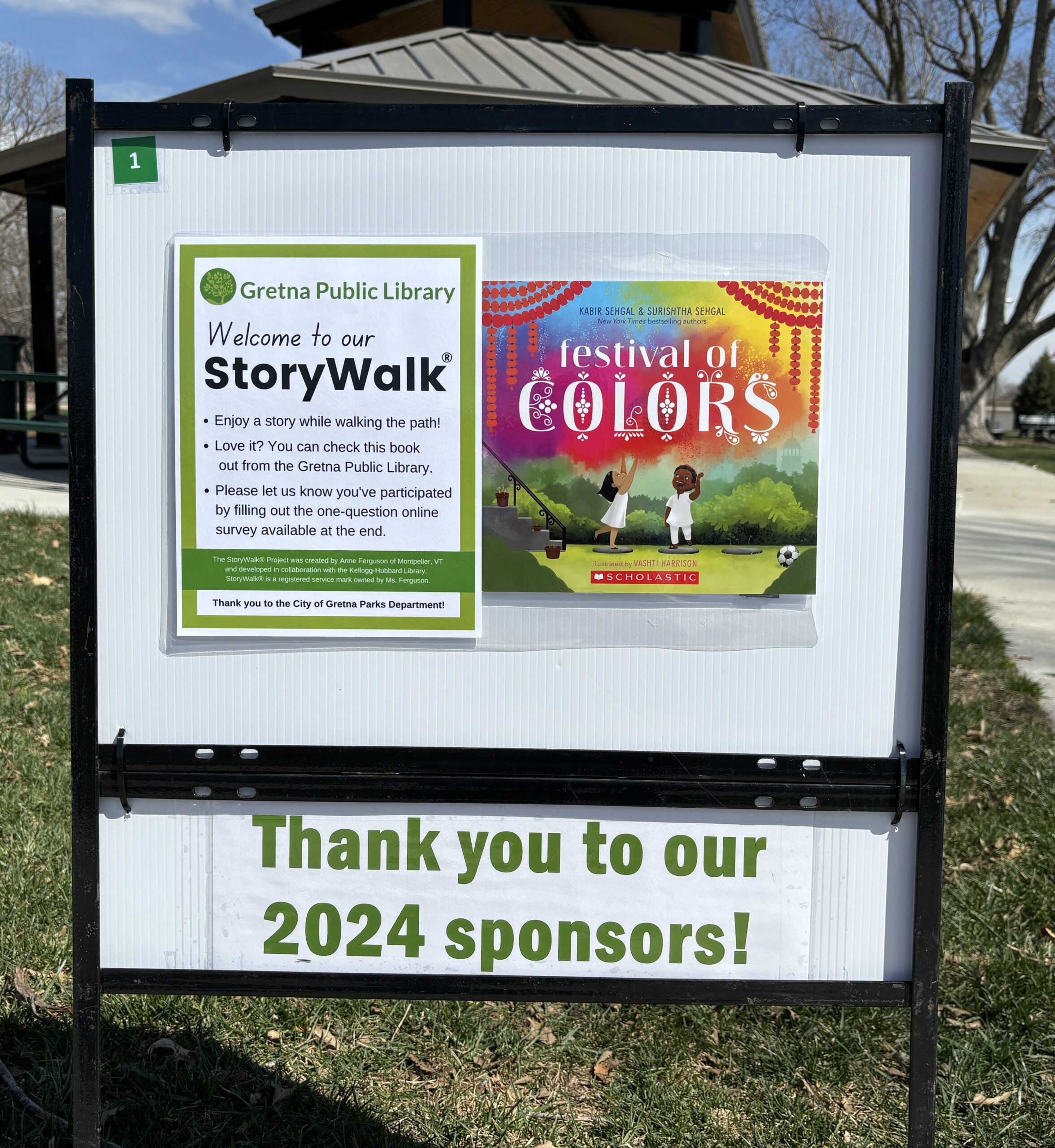 In 2021, we started providing a StoryWalk in Peterson Park during the warmer months. We take apart a book and then reassemble it on frames along the sidewalks so anyone can enjoy a story while they walk. This project has become very popular and we receive many positive comments. You can sponsor one of those pages for just $40 for the 2026 season, May-October. Your $40 helps us pay for the books, materials, and processing that each of those stories require.